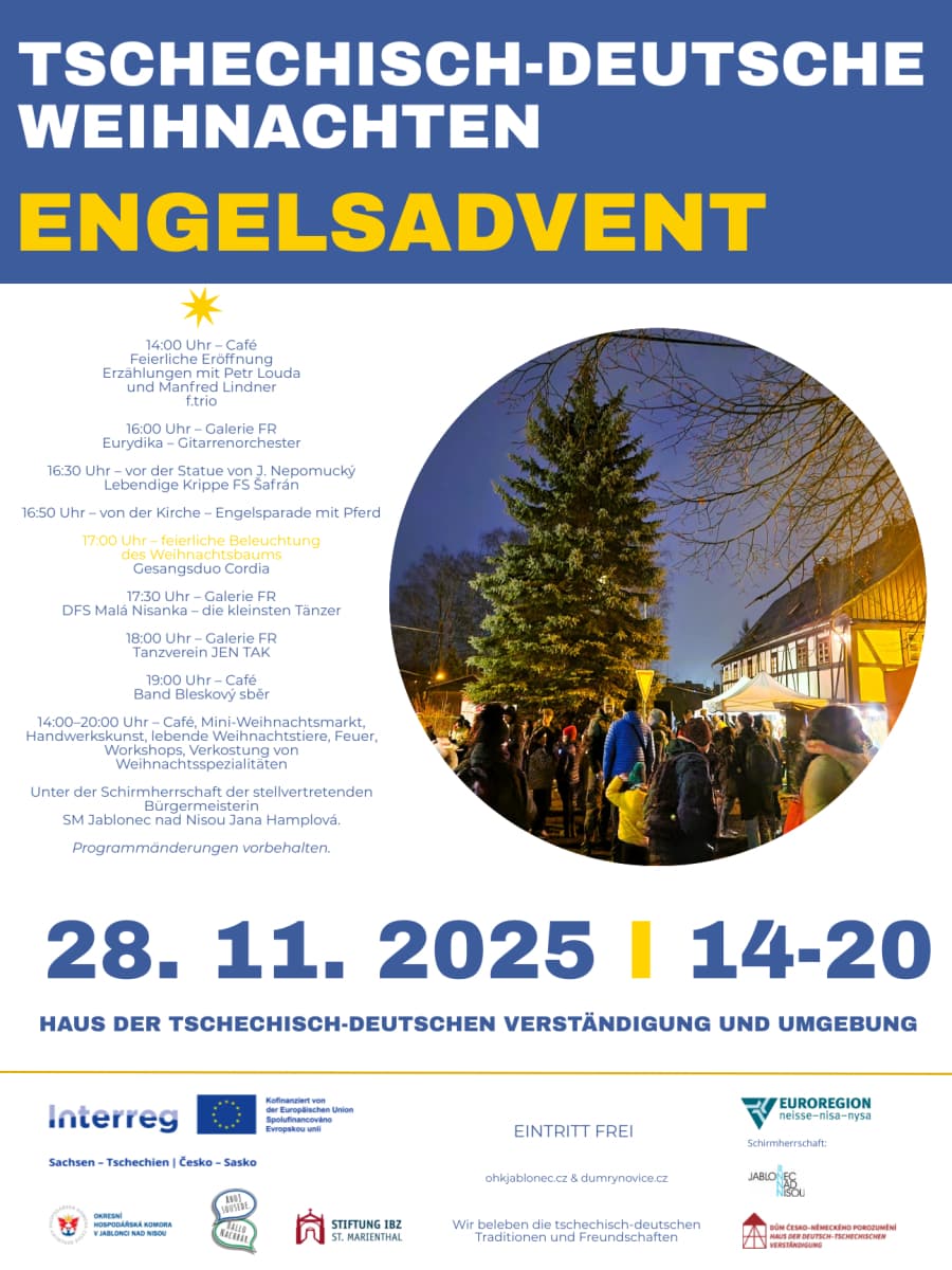 AktualizovatDas deutsch-tschechische Weihnachtsfest, der sogenannte EngelsAdvent, findet am Freitag, den 28. November 2025, von 14 bis 20 Uhr im Haus der tschechisch-deutschen Verständigung und in dessen Umgebung statt.